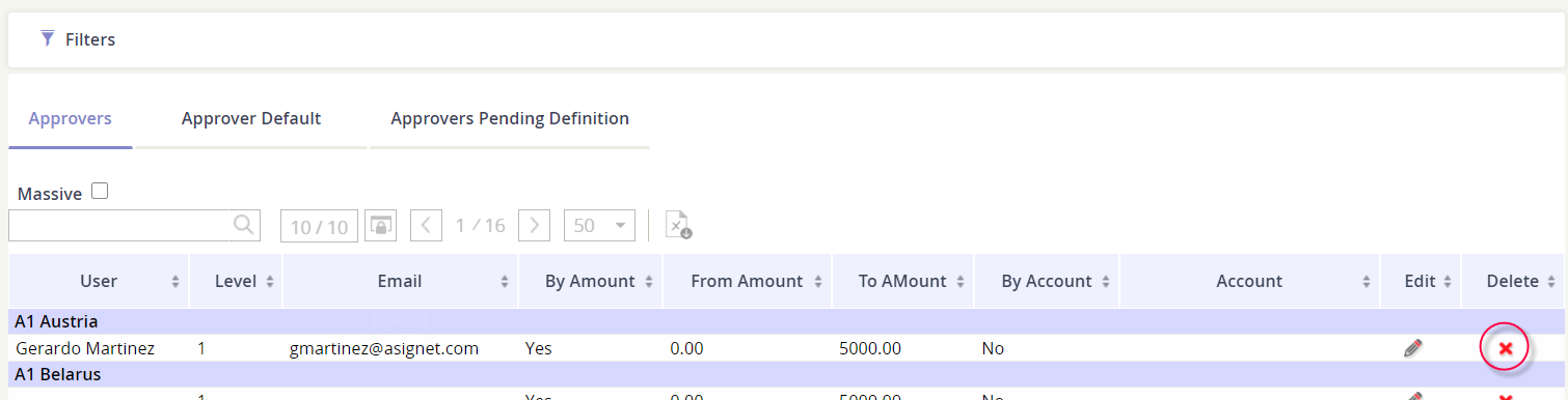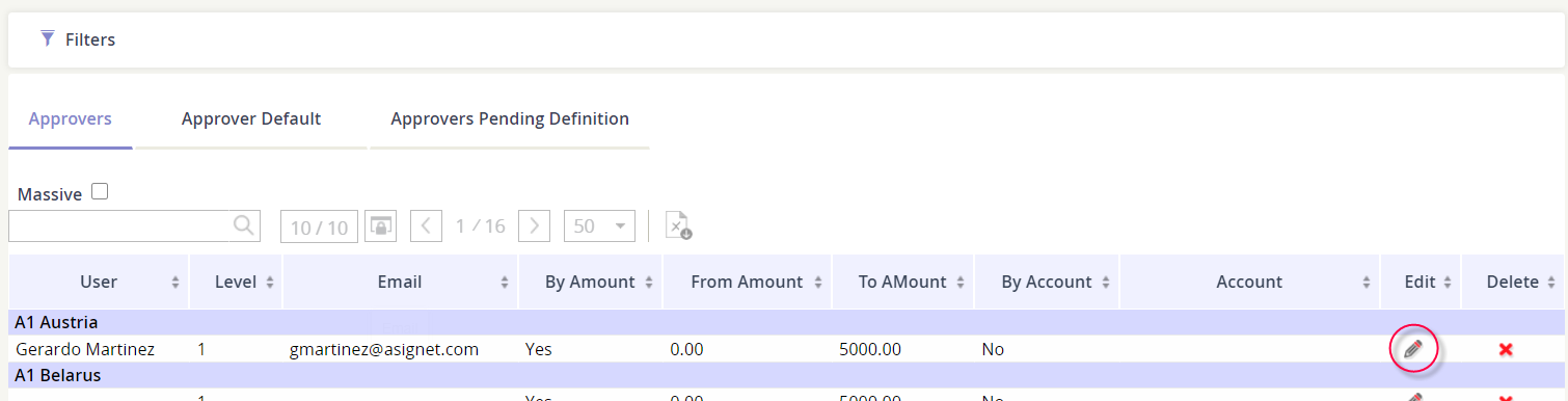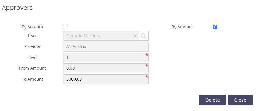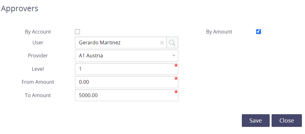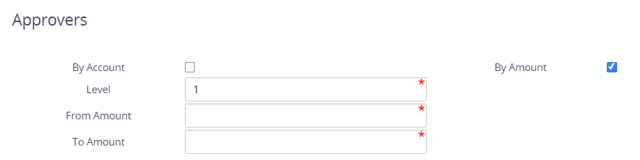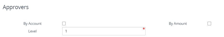 Level | Determine the Level in which the approver should appear. If you are building a structure from scratch, add all your Level 1’s first and then build up from there. The Level is required, regardless if the By Account or By Amount are selected. ![]() |
