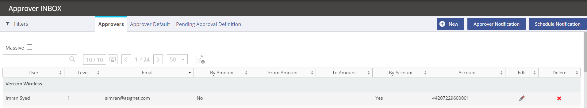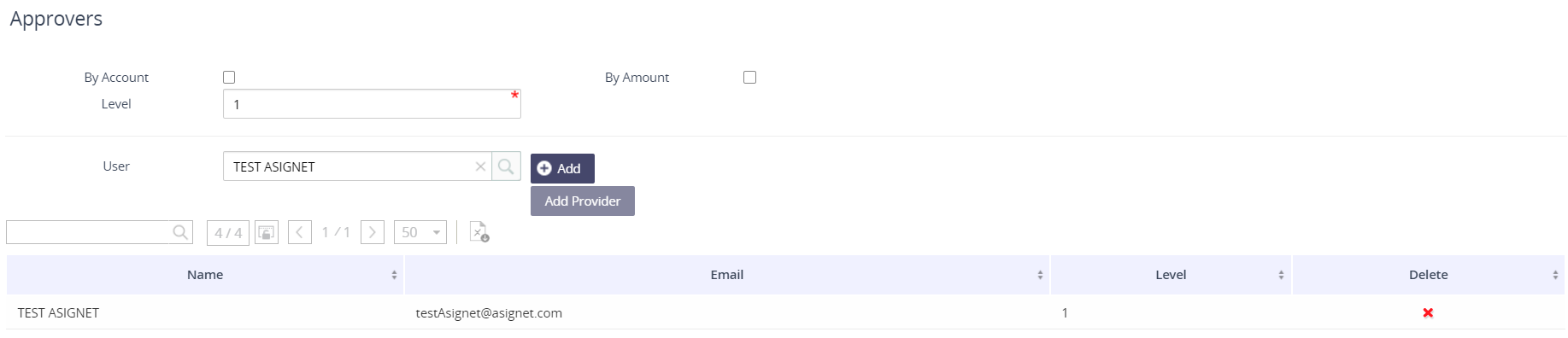 Once you have defined the By Account, By Amount, and/or Level, select the approver from the User drop down and click Add.