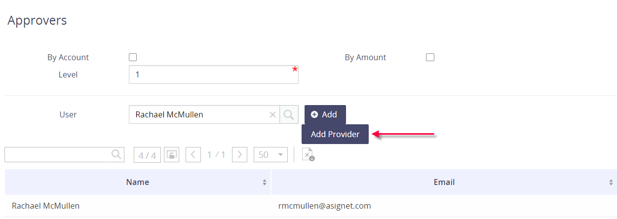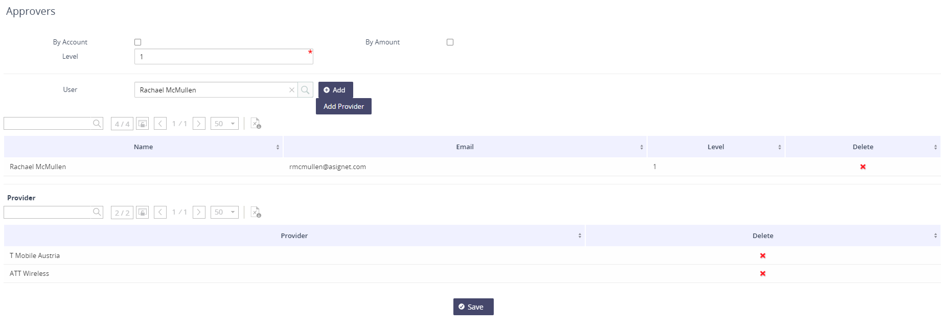 If you did NOT define By Account, you must click Add Provider and assign the user to a vendor - which means they will approve all accounts within that vendor.